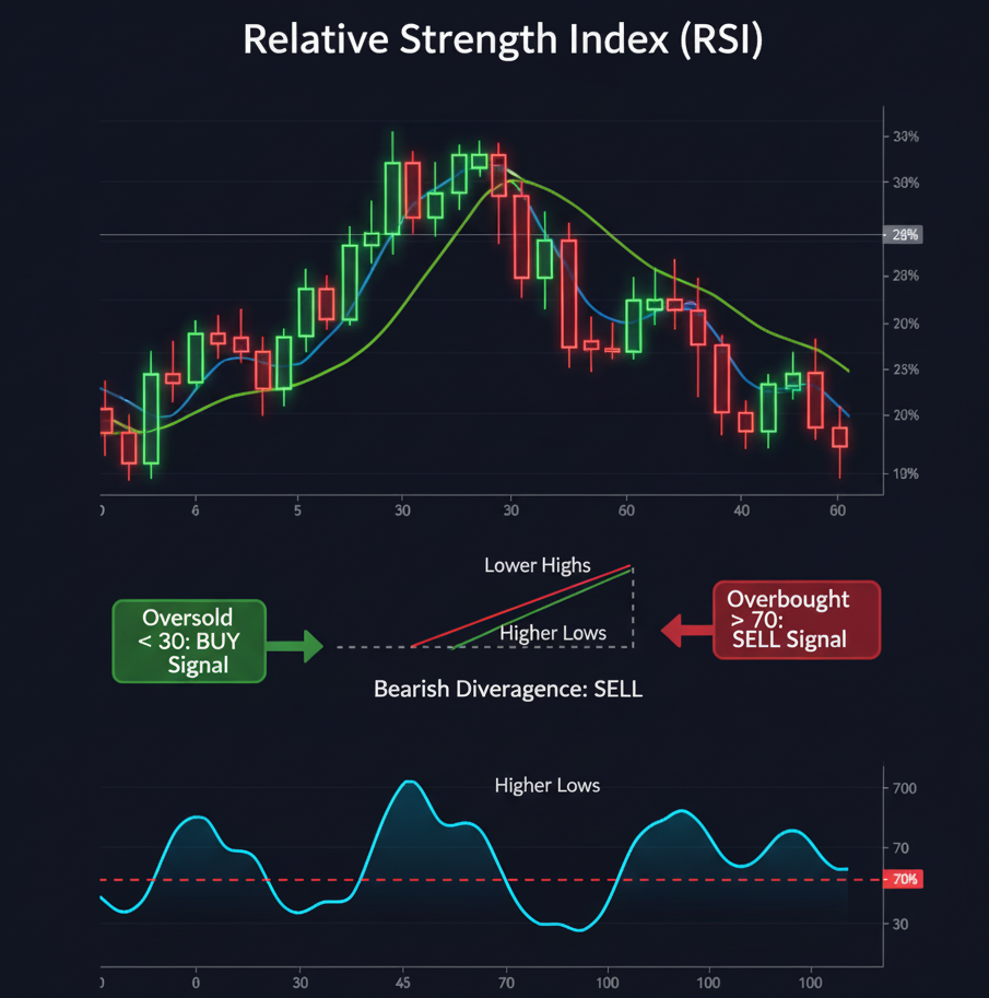 RSI là một chỉ báo thuộc nhóm Dao động (Oscillator), đo lường tốc độ và sự thay đổi của các biến động giá. Nó giúp Trader xác định liệu một tài sản đang bị Mua quá mức (Overbought) hay Bán quá mức (Oversold).