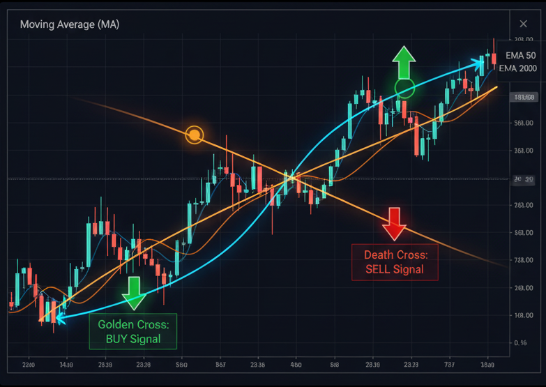 Đường Trung Bình Động (MA) là chỉ báo cơ bản và phổ biến nhất, giúp làm mượt dữ liệu giá để xác định xu hướng của thị trường.