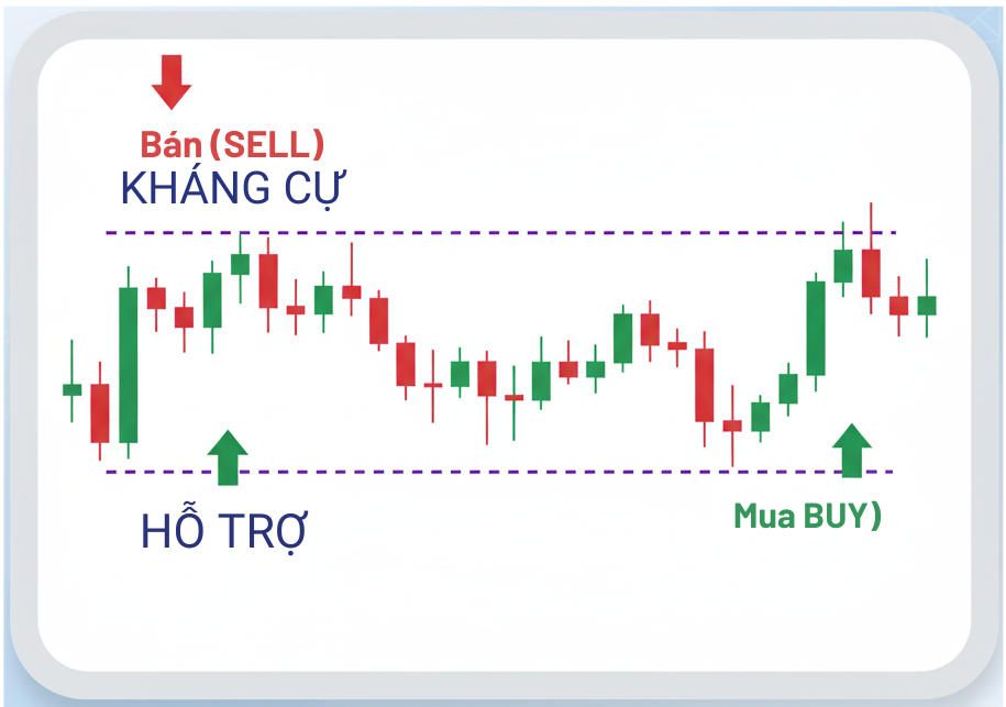 Hỗ Trợ/Kháng Cự | Mua ở Hỗ Trợ, Bán ở Kháng Cự | Vẽ đường ngang qua các điểm đảo chiều trước đó. | Thị trường đi ngang (Range) |