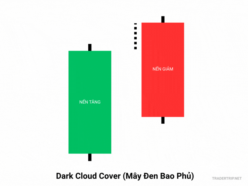 - Nến 2: Nến giảm, màu đỏ. Giá mở cửa của Nến 2 phải nằm trên giá cao nhất của Nến 1 (Gap tăng). Giá đóng cửa của Nến 2 phải nằm dưới 50% thân nến xanh của Nến 1.