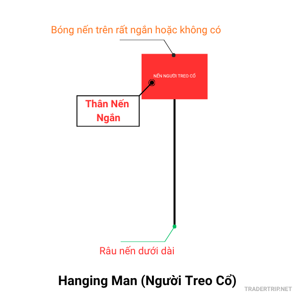 Nến Hanging Man có hình dạng giống như Nến Hammer, nhưng xuất hiện ở đỉnh xu hướng. Nó cho thấy trong phiên, phe bán đã cố gắng đẩy giá xuống rất sâu (tạo bóng dưới dài), dù sau đó phe mua có đẩy giá lên lại nhưng không thể duy trì được đà tăng mạnh mẽ như trước.