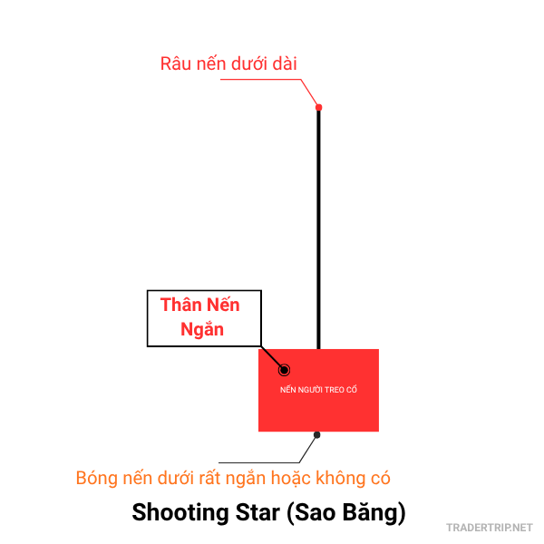 Nến Shooting Star (Sao Băng) có hình dạng như một ngôi sao rơi, là tín hiệu đảo chiều giảm rất mạnh. Nó cho thấy phe mua đã cố gắng đẩy giá lên cao kỷ lục (tạo bóng trên dài), nhưng ngay lập tức bị phe bán từ chối và đẩy giá xuống, buộc giá đóng cửa gần mức thấp nhất.