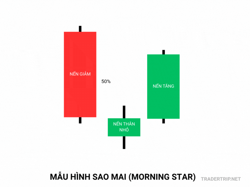 - Nến 2: Nến tăng dài, màu xanh. Giá mở cửa của Nến 2 phải nằm dưới giá đóng cửa của Nến 1 (tạo một khoảng Gap giảm). Giá đóng cửa của Nến 2 phải nằm trên 50% thân nến đỏ của Nến 1.