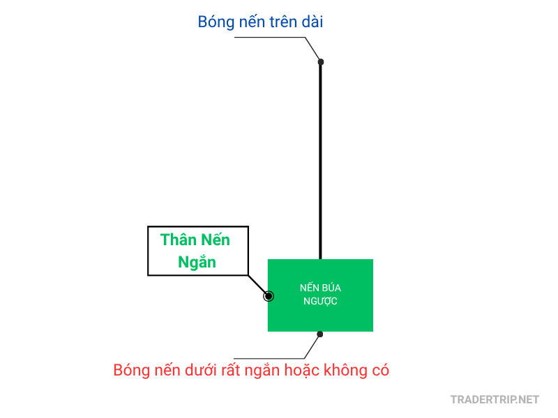 Nến Búa Ngược cho thấy phe mua đã cố gắng đẩy giá lên cao, nhưng không duy trì được (tạo ra bóng nến trên dài). Tuy nhiên, dù phe bán đã kéo giá xuống, họ chỉ có thể đóng cửa ở mức thấp gần mức mở cửa.