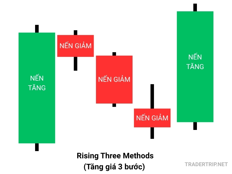 Mô hình Three Methods (Ba Bước) là một trong những mô hình phức tạp và đáng tin cậy nhất trong bộ nến tiếp diễn, thường bao gồm 5 cây nến, thể hiện sự điều chỉnh nhẹ nhàng trước khi lực chính quay trở lại thị trường.